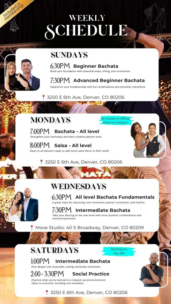 For experienced dancers who understand core bachata concepts and want to focus on technique, body movement, and partner flow. Not recommended for beginners.